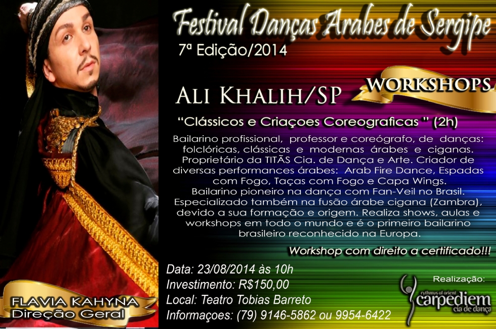 No próximo dia 23 de Agosto de 2014, Aracaju será palco da 7ª Edição do Festival Danças Árabes de Sergipe, no Teatro Tobias Barreto trazendo a Aracaju Ali Khalih (SP) bailarino brasileiro reconhecido Internacionalmente com participação especial das bailarinas Simone Mahayla(PE), Adriana Chayéra(BA), Marilyah Marques(BA) e do Quinteto de Cordas JR. Eventos Musicais(SE) que fará uma linda apresentação ao vivo. Alem dessas atrações vários grupos de dança do Estado e outras regiões do Brasil.