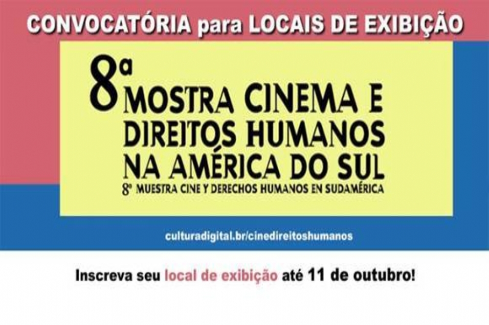 A 8ª Mostra Cinema e Direitos Humanos na América do Sul abre chamada para receber inscrição de quaisquer instituições e espaços culturais de todo o Brasil que tenham interesse em fazer parte do evento. Poderão participar da seleção e habilitação cineclubes; pontos de cultura; institutos federais de educação profissional, científica e tecnológica; universidades; museus; bibliotecas, sindicatos; associações de bairros; telecentros; unidades do Sistema S e outras instituições quaisquer que se habilitem a exibir os filmes da Mostra a parcelas da sociedade.
