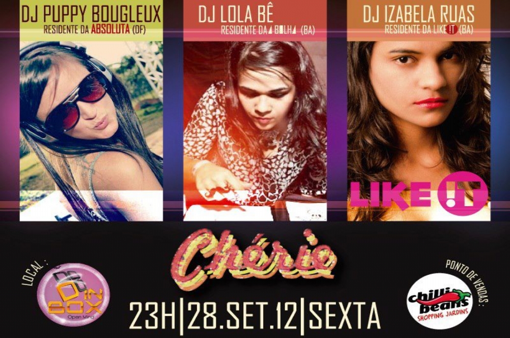 A Chérie está sendo organizada pela Madame Constatine Produções e terá como atrações as DJ’s Puppy Bougleux (DF), Lola Bê (BA) e Izabela Ruas (BA), além dos tequileiros. Os ingressos estão sendo vendidos na loja Chilli Beans do Shopping Jardins, ao valor de R$ 50,00 e ganhe R$ 30,00 em consumação. Não fique de fora dessa festa.