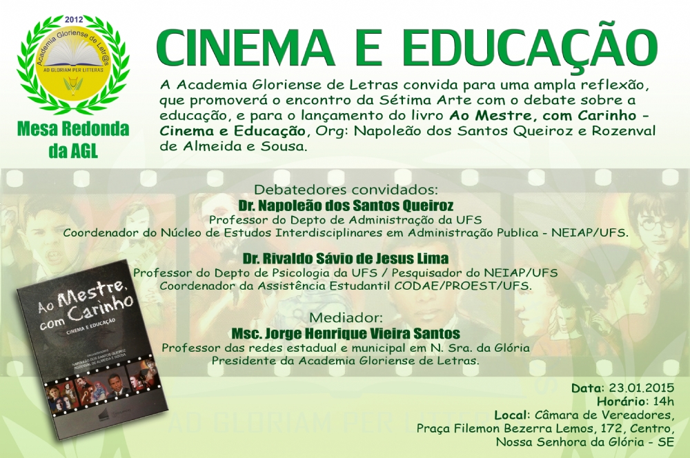 A Academia Gloriense de Letras abre suas atividades de 2015 com uma Mesa Redonda sobre Cinema e Educação, que será realizada no dia 23 de janeiro, a partir das 14h, na Câmara de Vereadores de Nossa Senhora da Glória.