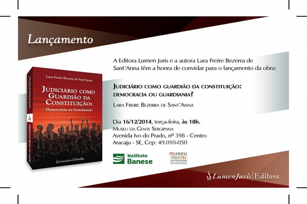 A advogada Lara Freire Bezerra de Sant’anna lançará o livro “Judiciário Como Guardião da Constituição: Democracia ou Guardiania?”, fruto da dissertação do curso de mestrado em Direito Público que a autora concluiu na Universidade Federal de Sergipe, sob a orientação da professora Jussara Jacintho.