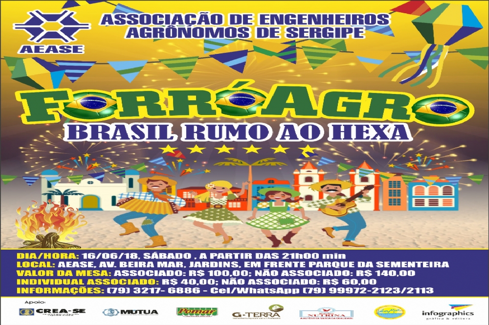 O Forró dos Engenheiros Agronômos (ForróAgro) será realizado no próximo sábado, dia 16, às 21h, na Sede da AEASE, localizada na Av. Beira Mar, 2400, Jardins, na capital.