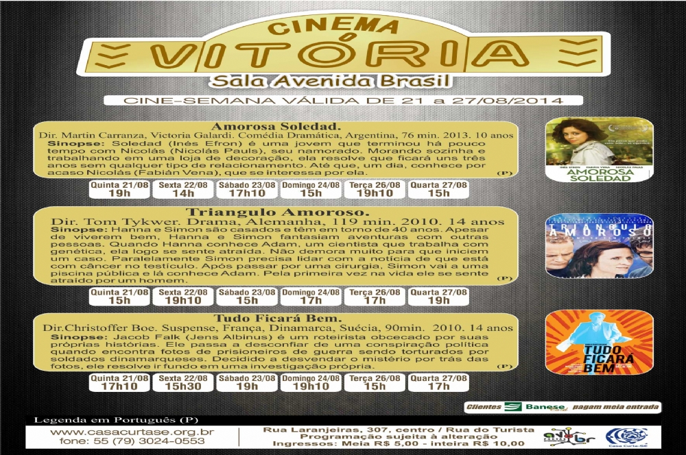 Além da estreia da semana, continuam em cartaz o drama alemão 'Triangulo Amoroso' e 'Tudo Ficará Bem', produção franco-dinamarquesa-sueca. No primeiro, Hanna e Simon são casados e têm em torno de 40 anos. Apesar de viverem bem, Hanna e Simon fantasiam aventuras com outras pessoas. Quando Hanna conhece Adam, um cientista que trabalha com genética, ela logo se sente atraída. Não demora muito para que iniciem um caso. Paralelamente Simon precisa lidar com a notícia de que está com câncer no testículo. Após passar por uma cirurgia, Simon vai a uma piscina pública e lá conhece Adam. Pela primeira vez na vida ele se sente atraído por um homem.