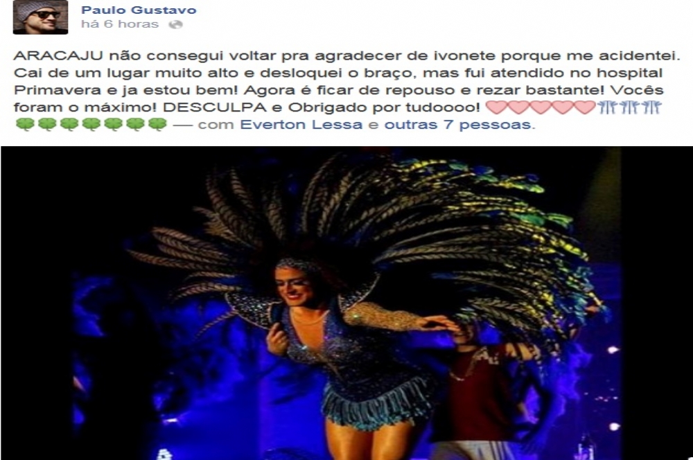 Durante espetáculo na capital sergipana o ator Paulo Gustavo sofreu um acidente. De acordo com informações da página oficial do ator, ele caiu e deslocou o braço. O ator foi atendido no Hospital Primavera e passa bem.