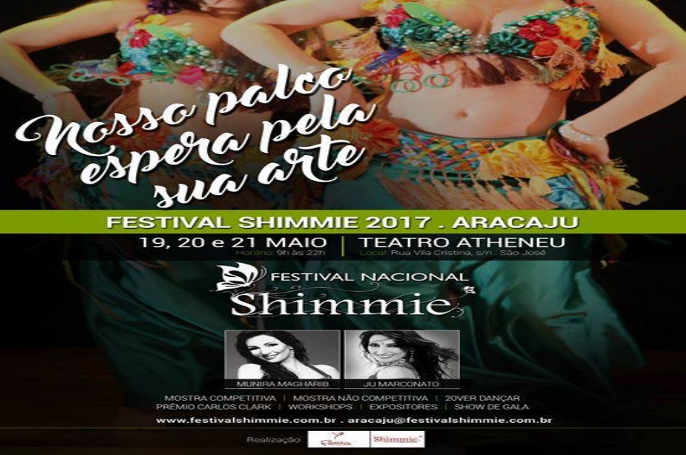 Um dos maiores eventos de Dança do Ventre da América Latina vem a Sergipe. O Festival Nacional Shimmie 2017 será realizado nos dias 19, 20 e 21 de Maio, no Teatro Atheneu, com direção da Revista Shimmie e de Catarina Hora, diretora da Fluence Danças, escola da capital sergipana. Bailarinas renomadas em todo o Brasil estarão em Aracaju participando do evento, a exemplo de Ju Marconato e Munira Magharib, ambas de São Paulo. Durantes os três dias haverá avaliações, workshops para os artistas que buscam maior aperfeiçoamento na sua dança, e também mostras de dança e shows para o público.