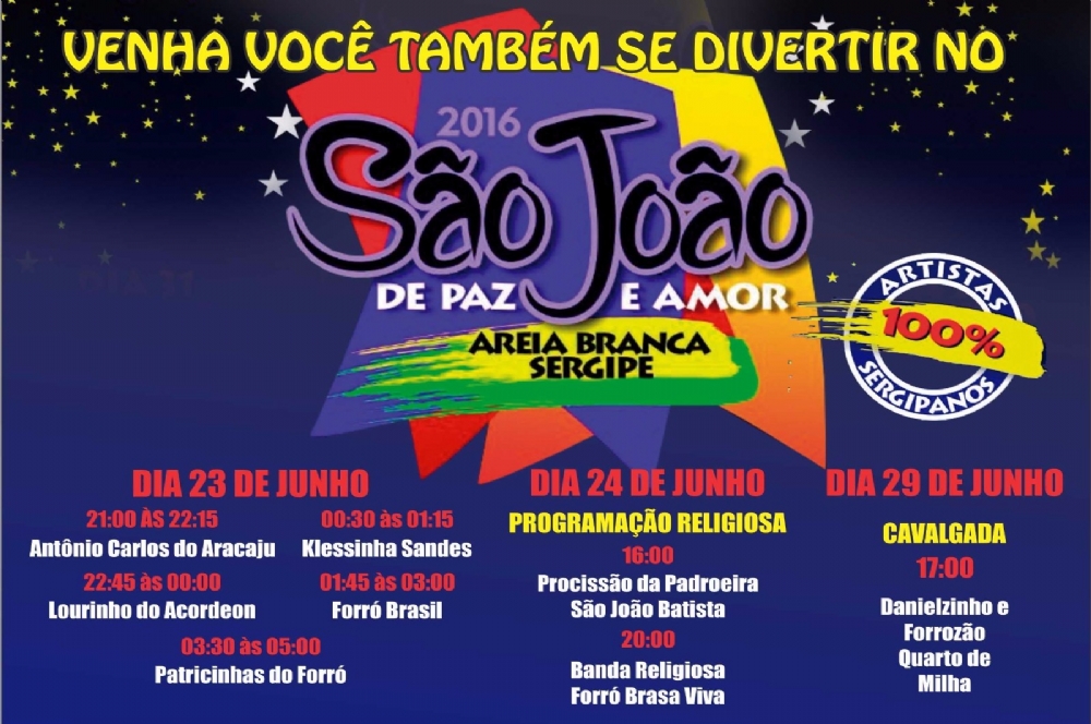 A cidade de Areia Branca é tradição quando o assunto é festa junina. O município, que fica há 36 km de Aracaju e recebe forrozeiros de todas as partes do Estado, é conhecido pelo São João de Paz e Amor.