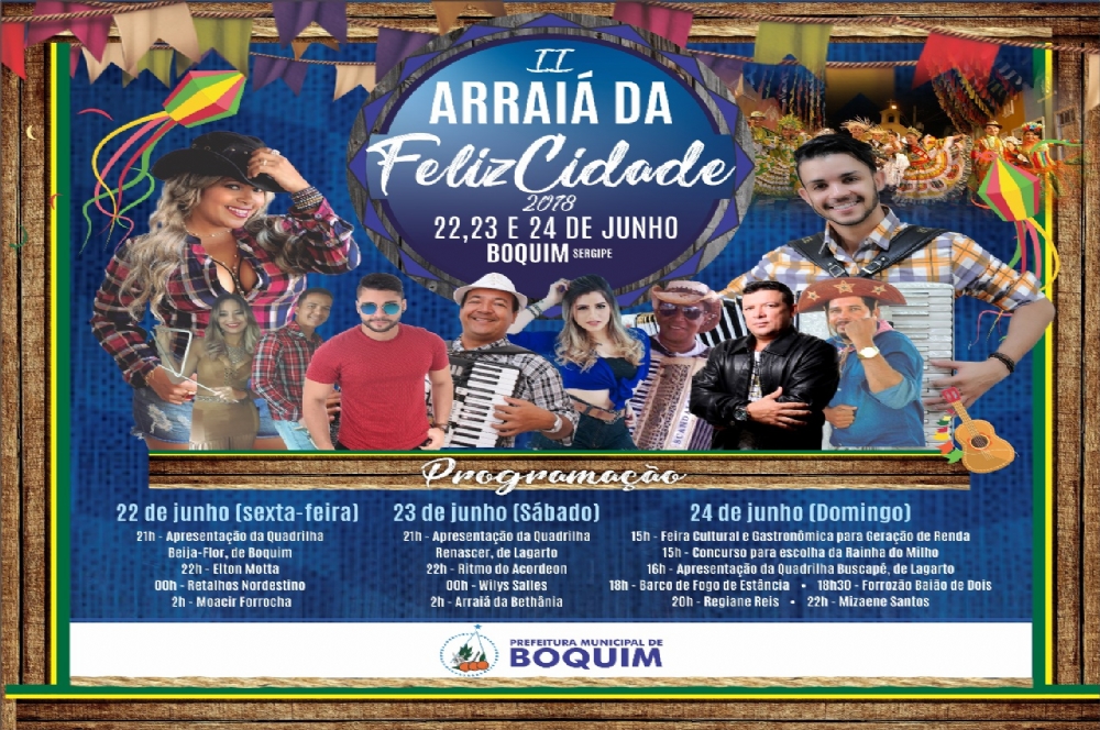 Em clima de Copa do Mundo os festejos juninos prometem movimentar Boquim nos próximos dias 22, 23 e 24 de junho, quando a Prefeitura monta o grande Arraiá da Feliz Cidade, na Praça Dr. Rinaldo Costa e Silva, a Praça do G Barbosa, enchendo a cidade de cor, alegria e fomentando o comércio local.
