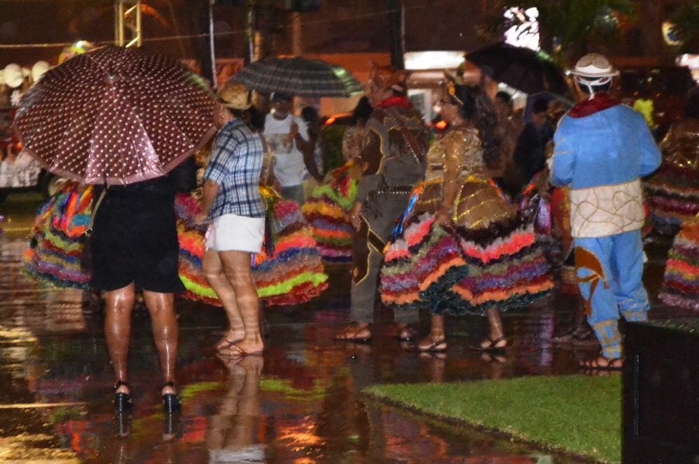 Regada a música e dança, começou a primeira noite do Arraiá do Povo nesta quinta-feira, 22. Sombrinhas, casacos e chapéus fizeram parte dos adereços usados pelos forrozeiros no evento que é realizado na Orla de Atailaia. Na chuva, nem o público deixou de ir à festa e nem as quadrilheiras do Peneirou Xerém interromperam a dança.