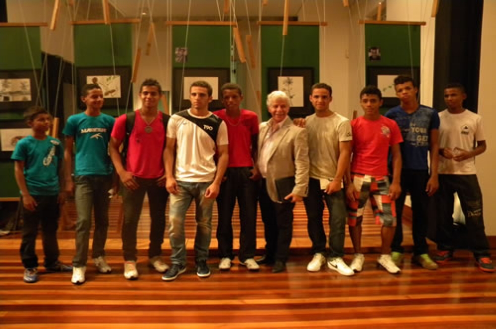 | Prof. Marco Namura com os alunos artistas (Foto: Ascom Instituto Banese) |