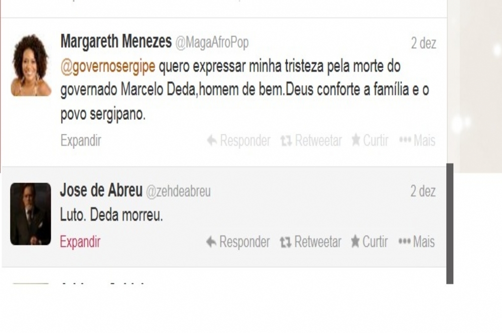 José de Abreu – Déda morreu. Resquiescat in Pace. Déda morreu. Luto. RIP Déda, o governador poeta… Triste. O último tuite dele foi pra me elogiar na novela. Vai com Deus, meu amigo Marcelo Déda.