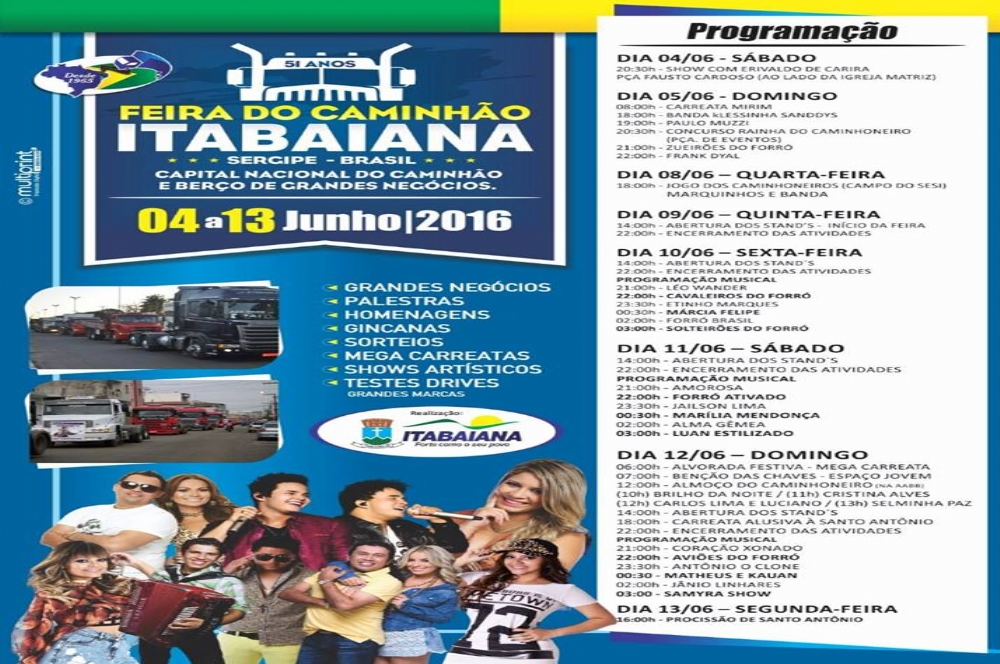 Na manhã desta sexta-feira, 13, a prefeitura da cidade de Itabaiana, distante cerca de 57 Km da capital sergipana divulgou a programação da 51ª Feira do Caminhão. A festa que já é tradição no Estado acontece de 4 a 13 de junho.