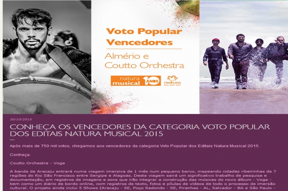 Foram mais de 750 mil votos em 26 dias e inúmeros vídeos, memes, gifs e campanhas de artistas consagrados para seus favoritos entre os cinco finalistas da categoria voto popular do Natura Musical. Entre inúmeros fãs, o cantor e compositor pernambucano Almério teve apoio de nomes como Elba Ramalho, Alceu Valença e Geraldo Azevedo. Já a banda sergipana CouttoOrchestra, em turnê pelo Brasil, investiu no papel de porta-voz da nova e efervescente cena musical de Aracaju.
