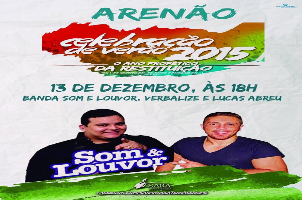 Neste sábado, 12, ocorrerá o último Arenão do ano com a presença da Banda Som e Louvor. O evento será a partir das 18h e contará ainda com a banda Verbalize e o cantor Lucas Abreu.