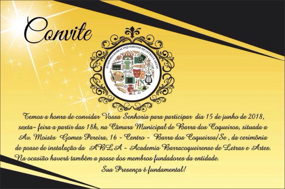 Depois de um ano de reuniões e debates será implantada nesta sexta-feira, dia 15 de junho, a partir das 18h, em solenidade na Câmara Municipal de Barra dos Coqueiros a Academia Barracoqueirense de Letras e Artes – ABLA.