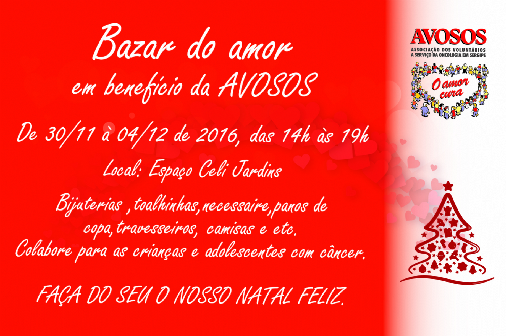 De 30 de novembro a 4 de dezembro, no Espaço Celi Sementeira Park (Celi Jardins), acontece o Bazar do Amor em benefício da Avosos – Associação dos Voluntários a Serviço da Oncologia em Sergipe. Aberto ao público em geral de 14h às 19h, o Bazar vai disponibilizar diversos itens: bijuterias, toalhinhas, necessaires, panos de copa, travesseiros, camisas e outros.