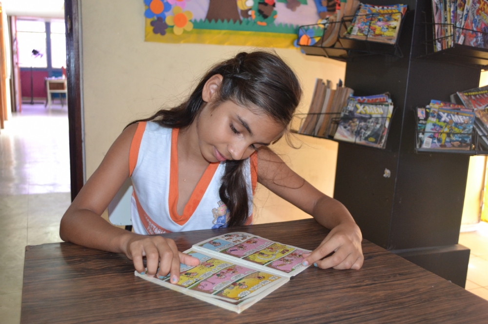 Apaixonadas por gibis da turma da Mônica, a pequena Barbara Almeida, de 9 aninhos, ficou encantada com o acervo de gibis da biblioteca e foi contundente: “Quero ler uns 10 antes de sair”. A garota ainda ouviu três histórias contadas por uma professora na manhã desta sexta-feira. Já Hugo Cardoso e o amigo preferiram ir à brinquedoteca após ouvirem as histórias. Tímido, Hugo disse que estava se divertindo e pretendia ainda ir a oficina de pinturas antes de ir para casa.