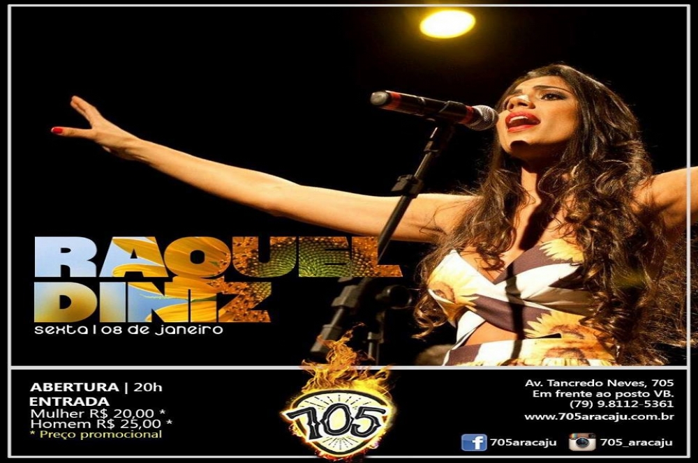 O início do final de semana será de diversão para os apreciadores da boa música brasileira. A festa ficará por conta da cantora sergipana Raquel Diniz que se apresentará na próxima sexta-feira, 08, na Casa 705 localizada na avenida Tancredo Neves em frente ao posto VB, bairro Inácio Barbosa.
