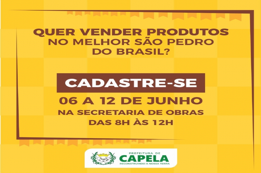 A prefeitura de Capela iniciou na última terça-feira, 6, o cadastramento de pessoas interessadas em comercializar produtos na Praça Adroaldo Campos (Eventos), no período de 29 de junho a 2 de julho, quando acontece os festejos do São Pedro/Mastro. O atendimento acontece na Secretaria Municipal de Obras, até o próximo dia 12, das 8h às 12h.