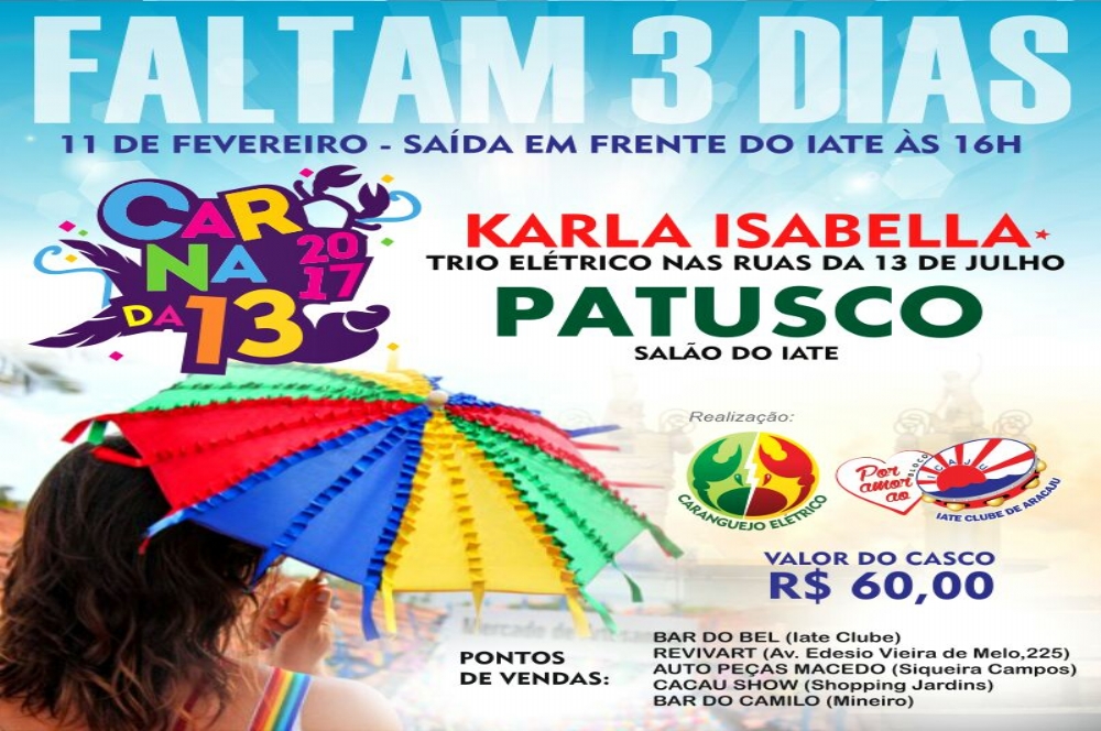 Neste sábado, dia 11, a avenida Treze de Julho volta a receber a alegria de uma grande prévia carnavalesca. O Carna da 13, festa promovida através de parceria entre o Bloco Caranguejo Elétrico e o Iate Clube de Aracaju (Icaju), terá início às 16h, com concentração no Iate Clube. A cantora Karla Isabela comandará a festa no trio.