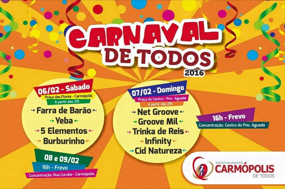 O município de Carmópolis realiza de 6 a 9 de fevereiro, Carnaval 2016. Entre as principais atrações, estão a banda Farra de Barão, 5 Elementos, Trinka de Reis e Cid Natureza.