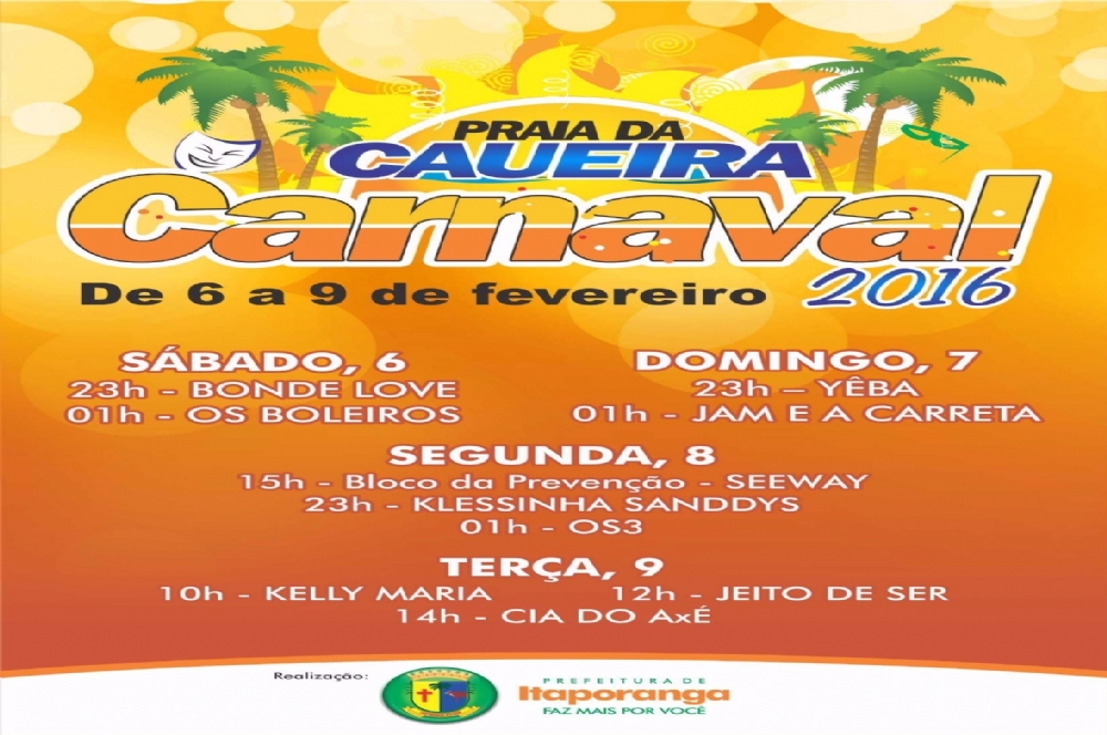 A Prefeitura de Itaporanga D’Ajuda, através da Secretaria Municipal da Cultura e Turismo, divulga a programação oficial do melhor Carnaval do Litoral Sul de Sergipe, que terá quatro dias de muita alegria. No período de 6 a 9 de fevereiro, a Praça de Eventos da Praia da Caueira, em Itaporanga D’Ajuda, terá atrações locais e nacionais que farão a animação do Carnaval de Paz e Amor.