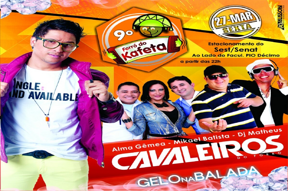 Cavaleiros do Forró, Alma Gêmea, Mikael Batista e Dj Mateus são as atrações do 9º Forró da Kafeta no dia 27 de março, a partir das 22h, no estacionamento do Sest/Senat (ao lado da Faculdade Pio Décimo).