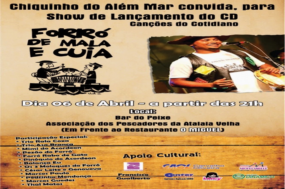 O show de lançamento do CD de ‘Chiquinho do Além Mar’ ‘Canções do Cotidiano’ com o Forró do Mala e Cuia ocorrerá no dia 6 de abril, às 21h, no bar do Peixe, localizado na Associação dos Pescadores da Atalaia Velha, em frente ao restaurante O Miguel no bairro Atalaia, na capital sergipana.