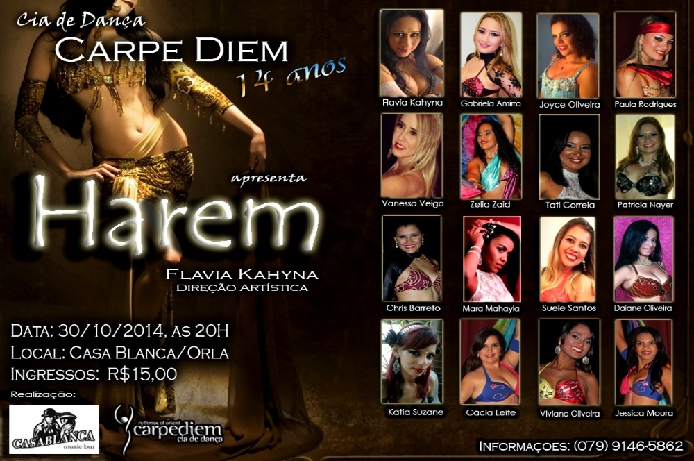 No próxima quinta-feira,30, acontece às 20h o show "Harem". A festa é uma comemoração especial pelos 14 anos da CIA de Dança Carpe Diem. A produção da festa contará com uma noite de luzes coloridas e intensos movimentos, que ganham forma, cor, música e vida nas apresentações.