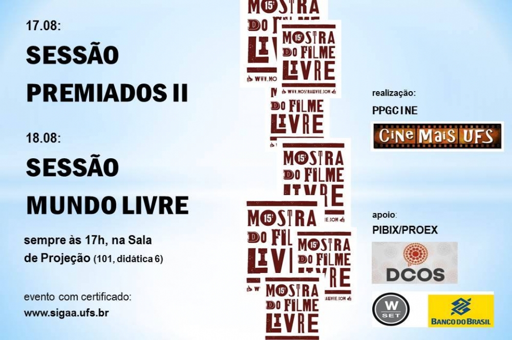 O Cine Mais UFS, em parceria com o Programa de Pós-Graduação em Cinema (PPGCINE) realiza a Mostra de Filmes Livre (MFL). Serão dois dias de exibição gratuita e aberta à comunidade. Sempre às 17 horas, na sala de projeção (101) da Didática 6, do campus São Cristóvão. As sessões são acompanhadas de debates e com direito a certificados no SIGAA.
