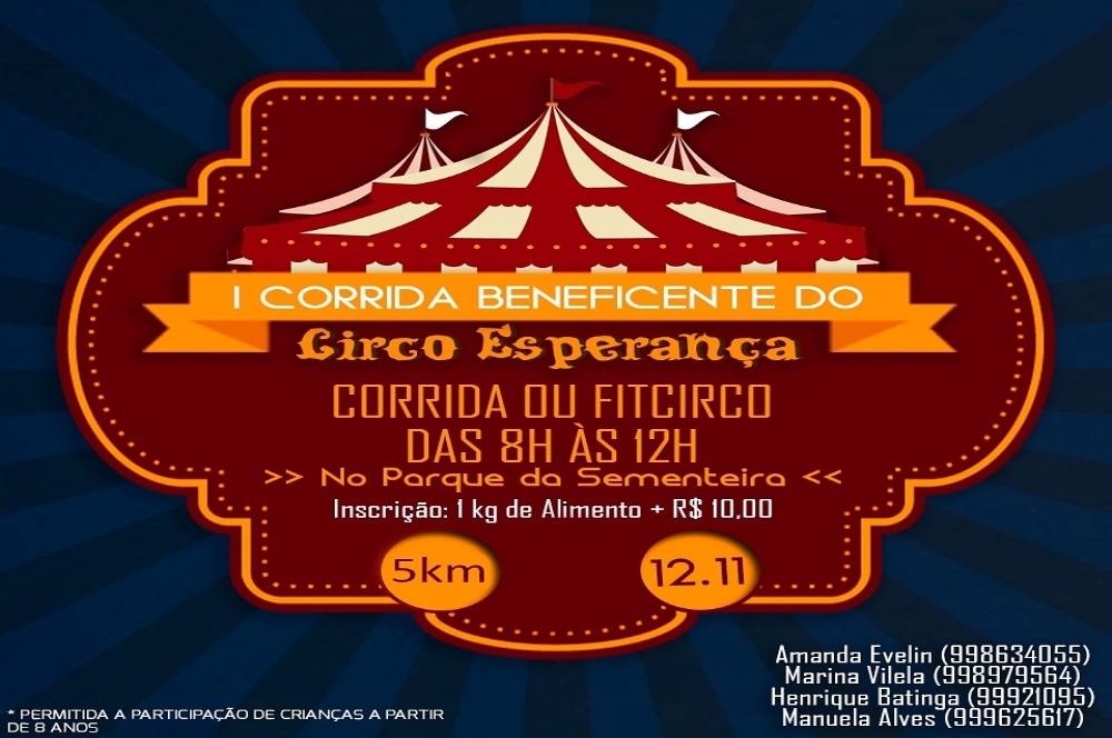 Vem aí a I Corrida Beneficente do Circo Esperança. O evento acontece no sábado, 12 de novembro, a partir das 8h, no Parque da Sementeira, em Aracaju. A corrida será dividida por categorias, de acordo com as idades. A idade mínima para participar é de oito anos.