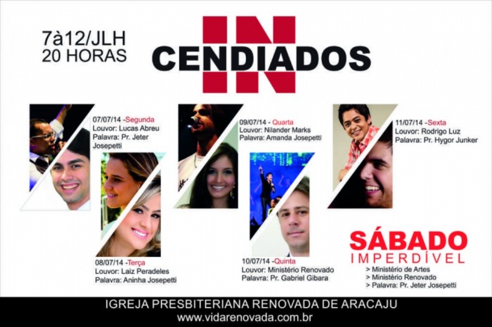 De 7 à 12 de julho na Igreja Presbiteriana Renovada acontece a conferência Incendiados com participações do Ministério Renovado, Lucas Abreu, Laiz Peradeles, Nilander Marks e Rodrigo Luz. Ministração da Palavra com Aninha Josepetti, Pastor Gabriel Gibara, Pastor Hygor Junker, Pastor Jeter Josepetti e Amanda Josepetti.