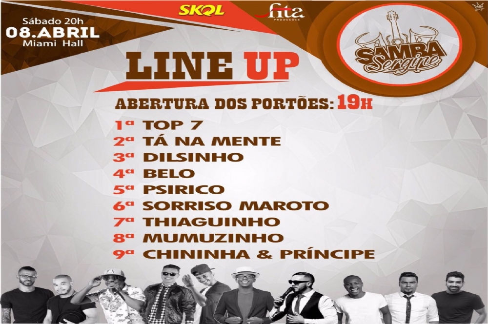 A empresa produtora do Samba Sergipe divulgou a ordem das atrações da festa. O grupo sergipano Top 7 abre a festa e o encerramento fica por conta de Chininha e Príncipe.