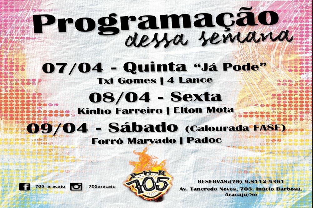 Como todo mundo já sabe, quinta-feira já é o dia da semana em que está próximo do fim de semana e a sensação de dever cumprido com as responsabilidades da vida também já existe em cada um. Por isso, o 705 Pub lançou o “Quinta Já Pode” em Aracaju, com atrações musicais e promoções para tornar cada noite inesquecível.