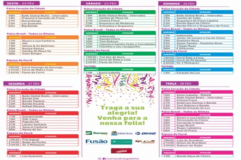 A organização do Rasgadinho divulgou na manhã desta quarta-feira, 22, a programação oficial do evento para este ano. A festa acontecerá entre os dias 24 e 28 de fevereiro e prioriza apresentação de bandas sergipanas. As atrações estarão divididas em três palcos da avenida Pedro Calazans e terá ainda, durante a tarde, uma banda fazendo o cortejo pelas ruas do centro.