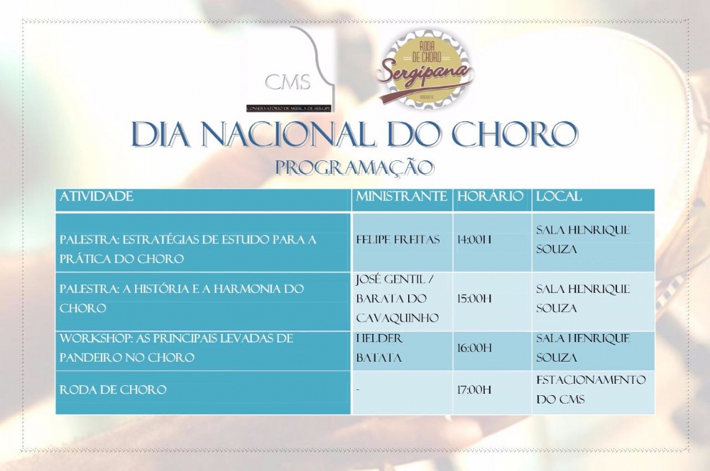 O Conservatório de Música (CMS) irá realizar programação artística e cultural para comemorar o Dia Nacional do Choro. Na próxima quinta-feira, 20, a partir das 14h, acontecerão palestras e workshops abertos e gratuitos. O evento será culminado com uma grande roda de choro, que acontecerá às 17h, no estacionamento do Conservatório, situado à rua Boquim, Centro de Aracaju.