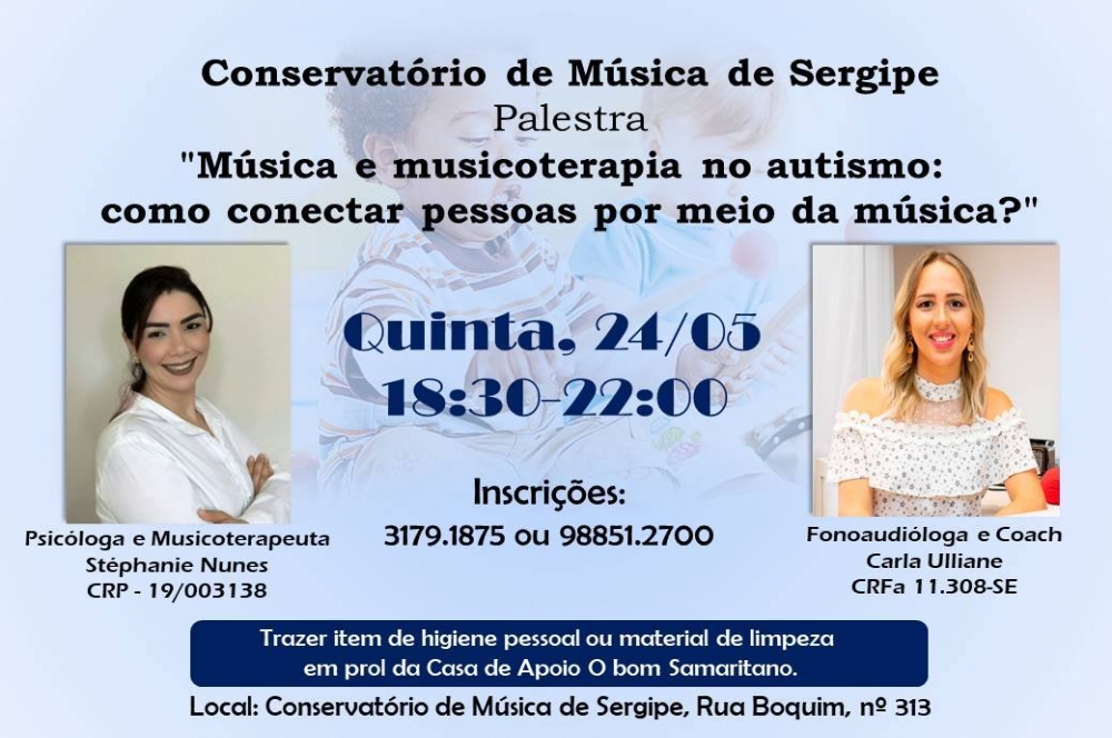 O Conservatório de Música de Sergipe realiza, na noite desta quinta-feira, 24, uma palestra sobre Música e Musicoterapia no Autismo. Com o tema “Como conectar pessoas por meio da música?”, o evento acontecerá no próprio conservatório, das 18h30 às 22h.