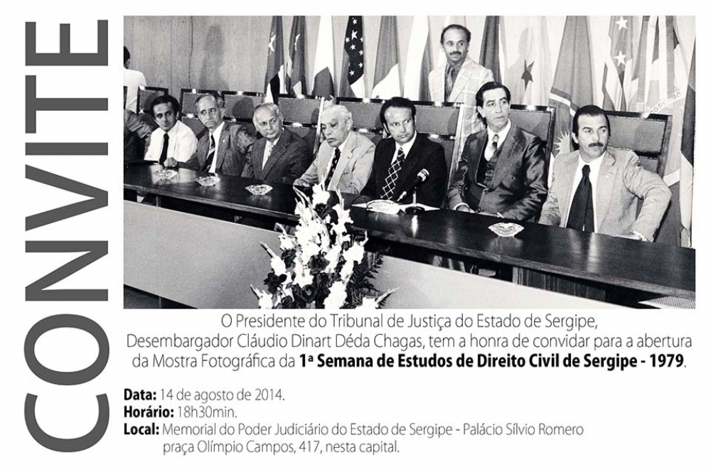 Abertura da Mostra Fotográfica da 1ª Semana de Estudos de Direito Civil de Sergipe – 1979, que acontecerá às 18h30 do dia 14 desse mês, no Memorial do Poder Judiciário. O Memorial do Tribunal de Justica de Sergipe fica localizado no Palácio Sílvio Romero, Praça Olímpio Campos, 417 – Centro. Para mais informações (79) 3213-0219 / 3213-0771.