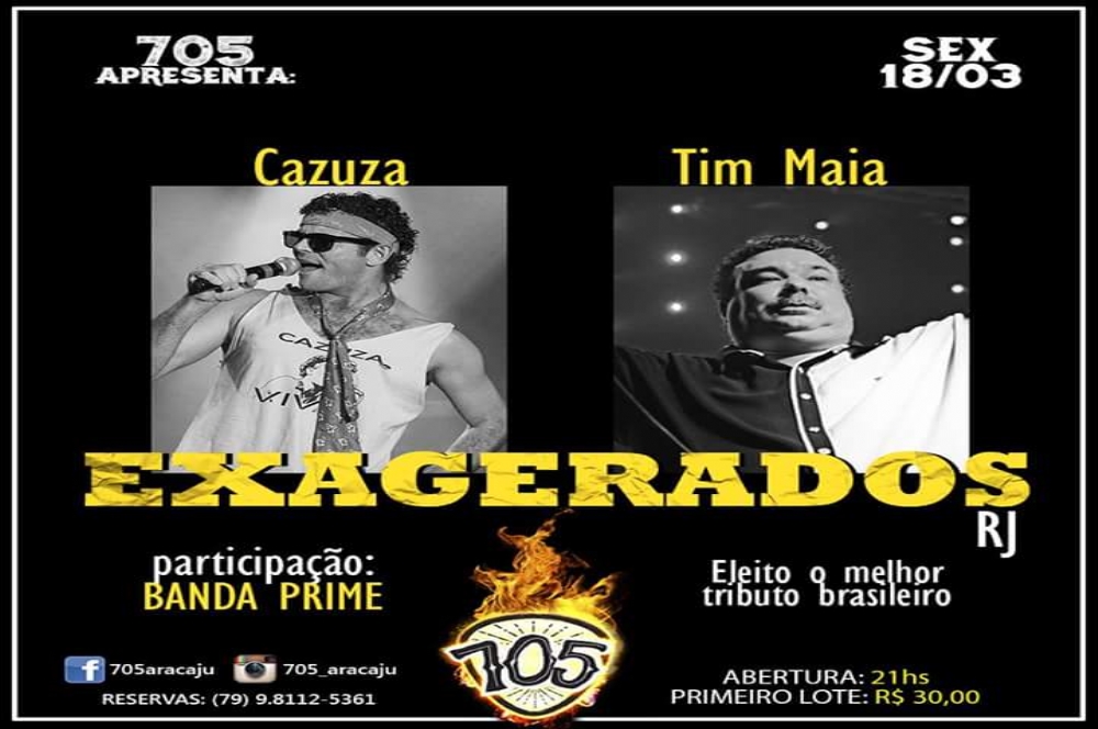 Eleito o melhor tributo brasileiro, os ''Exagerados'' fazem show nesta sexta-feira, 18, no bar 705 em Aracaju. Valério Cazuza e Victor Sávios interpretam dois dos maiores poetas do rock nacional: Cazuza e Tim Maia, em um show recheado de emoção. A noite também terá a apresentação da banda Prime.