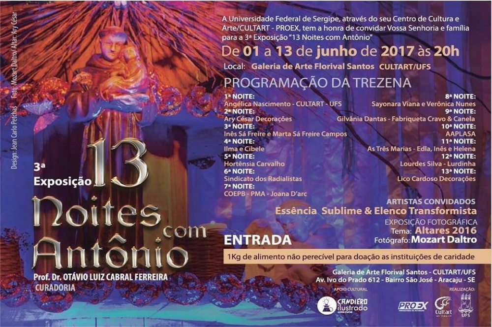 A Universidade Federal de Sergipe, através do Centro de Cultura e Arte (Cultart/UFS) e a Pró-reitoria de Extensão (PROEX), realiza a partir do dia 01 de junho a 3ª Exposição “13 Noites com Antônio”. As treze noites acontecerão na Galeria de Arte Florival Santos, localizada no Cultart/UFS, na Avenida Ivo do Prado, nº 612, bairro São José.