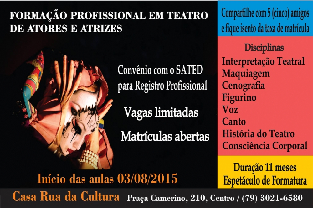 A Casa Rua da Cultura conveniada com o SATED-SE, está oferecendo, o Curso de Formação Profissional para Atrizes e Atores. O início é dia 3 de agosto. A dureção do curso é de 11 meses. A taxa de matrícula é de R$50.