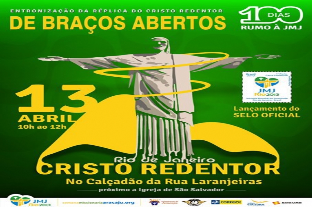 A partir de hoje, 12, começa a contagem regressiva para Jornada Mundial da Juventude (JMJ). Faltarão 100 dias para a Jornada e para comemorar esse marco, a Arquidiocese de Aracaju, irá entronizar uma réplica do Cristo Redentor do Corcovado, o maior cartão postal do Brasil, em virtude da comemoração de 80 anos de existência do monumento; que foi recebido pelo Arcebispo Dom José Palmeira Lessa, em 24 de agosto de 2012, durante o congresso da Juventude (JMJ RIO 2013).