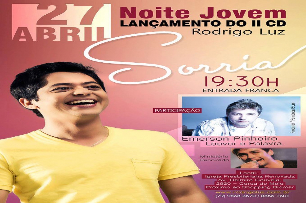 No dia 27 deste mês o cantor gospel Rodrigo Luz lançará seu II CD intitulado "Sorria". A Noite Jovem ocorrerá às 19h30 na Igreja Presbiteriana Renovada, localizada na avenida Delmiro Gouveia, na Coroa do Meio. A entrada é franca e terá a participação do pastor Emerson Pinheiro e do Ministério Renovado.