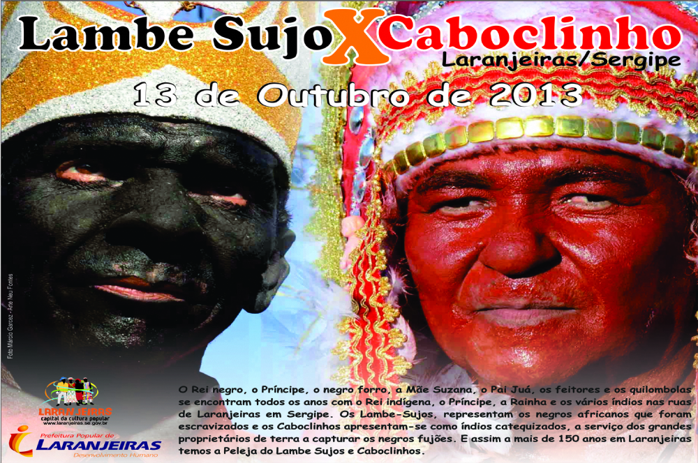 A Prefeitura de Laranjeiras, através da Secretaria Municipal de Cultura realiza neste domingo, 13, mais uma edição da tradicional festa dos Lambe-Sujos e Caboclinhos, que todos os anos é encenada no segundo domingo de outubro. A programação terá início às 4h30min, com a alvorada e cortejo dos Lambe-Sujos e Caboclinhos pelas principais ruas da cidade. Às 9h é realizada uma bênção em frente à igreja Matriz Sagrado Coração de Jesus. Em seguida, às 15h30min, acontecerá a chamada peleja, que se encerra pontualmente às 17h.