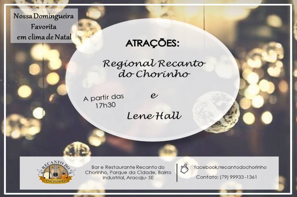 Neste domingo, 20, a partir das 17h30, o restaurante Recanto do Chorinho, apresenta uma programação especial voltada para o período natalino com choro e seresta. Os artistas do Regional Recanto do Chorinho e Lene Hall vão fazer a festa.