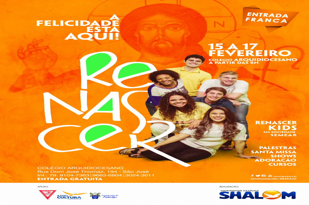 A Comunidade Católica Shalom realizará nos dias 15, 16 e 17 de fevereiro a 20ª edição do Renascer, no Ginásio do Arquidiocesano. O evento tem entrada franca e início sempre às 8h da manhã, estendendo-se até às 19h. A programação do evento conta com palestras, atividades artísticas, orações, louvor, Missa e Adoração ao Santíssimo Sacramento. A animação fica por conta dos músicos da Comunidade Shalom.