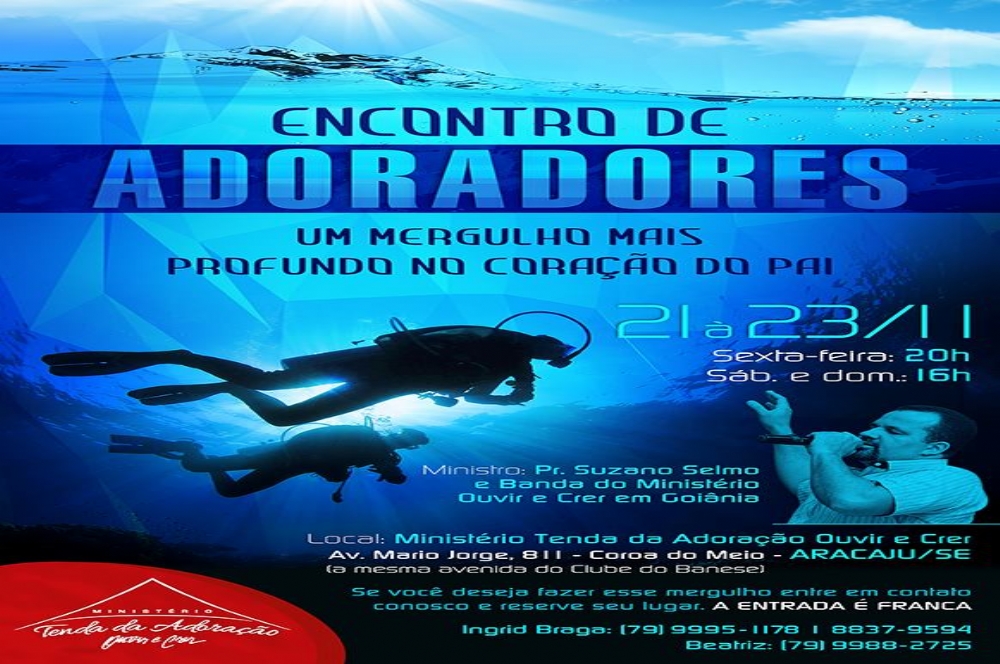 O Ministério Tenda da Adoração Ouvir e Crer realiza entre os dias 21 a 23 desse mês, o Encontro de Adoradores com o tema: ‘Um mergulho mais profundo no coração do Pai’. O evento iniciará na sexta-feira a partir das 20h e no sábado,22 e domingo,23, será a partir das 16h.