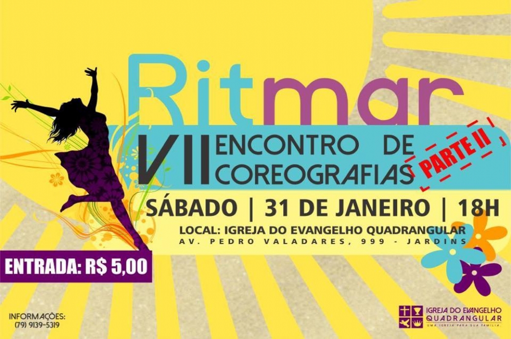 O Encontro de Coreografias promovido pela Igreja do Evangelho Quadrangular em Sergipe ocorrerá no dia 31 desse mês. As apresentações ocorrerão na avenida Pedro Valadares, 999, no bairro Jardins, zona sul da capital sergipana. Entrada R$ 5.