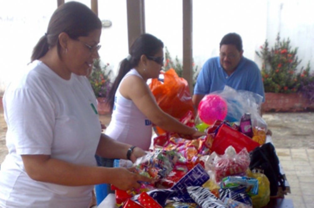 Na foto, destaca-se um grupo dedicado a realizar trabalhos manuais, produzidos pelo Centro Caboclo Tupy, Rosa Azul, creches e orfanatos.