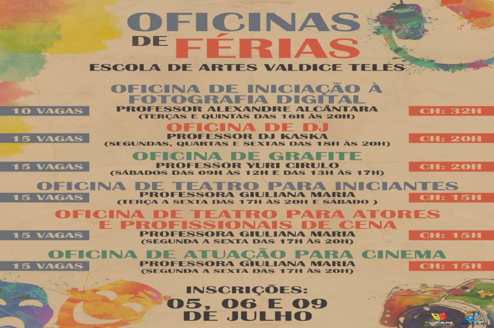 A Escola de Artes Valdice Teles inicia nesta quinta-feira, 5, as inscrições para oficinas de férias nas áreas de fotografia, música, grafite e teatro. As aulas serão ministradas de 10 de julho a 11 de agosto, na própria unidade, que é vinculada à Fundação Cultural Cidade de Aracaju (Funcaju).