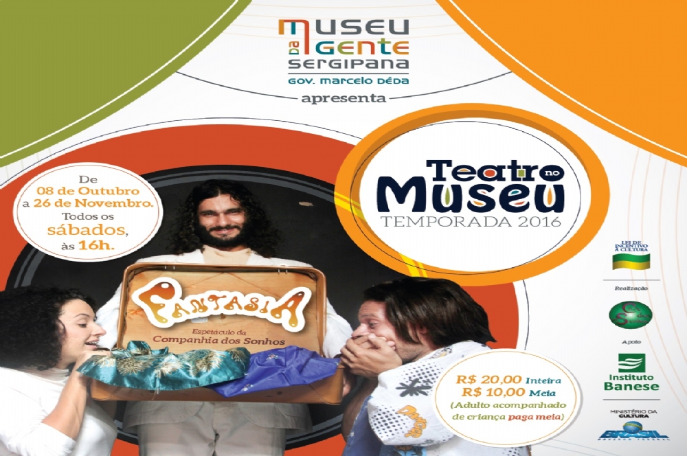 A partir do dia 08 de outubro será a vez da ‘Cia. dos Sonhos’ abrilhantar as tardes de sábado no Museu da Gente Sergipana. A Cia. encenará o espetáculo ‘Fantasia’, último a se apresentar na temporada 2016 do Teatro no Museu, uma iniciativa promovida pelo Museu da Gente Sergipana Gov. Marcelo Déda e o Instituto Banese, juntamente com cias. de teatro sergipanas, com o objetivo de abrir espaço para projetos de artes cênicas direcionados ao público infantil e infanto-juvenil, fomentar a produção artística local e a formação de plateia.
